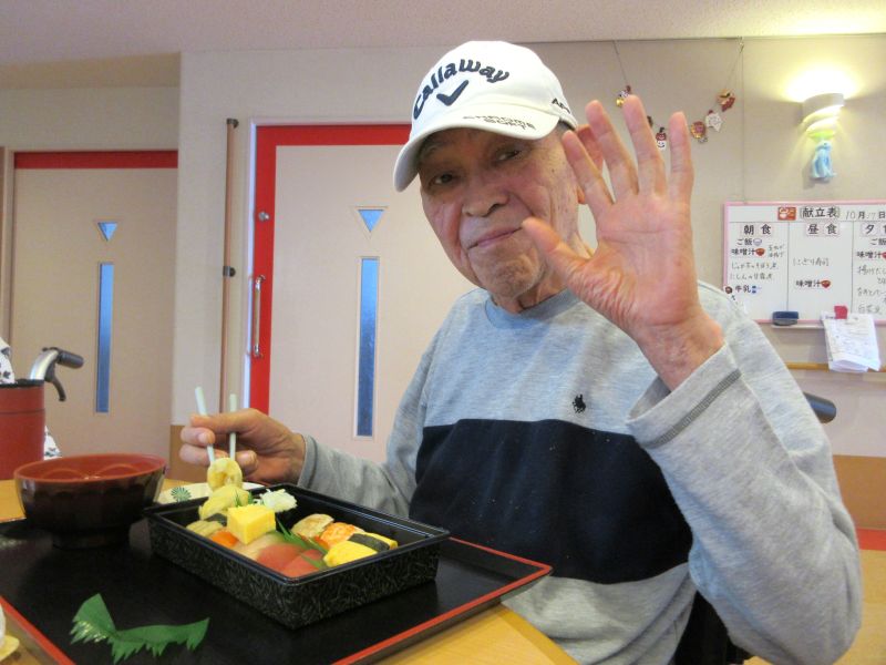 寿司の日 本日は、年3回実施している寿司の日でした。 「今日はお寿司なんだってね」と楽しみにされる声が聞かれ、配膳されると笑顔で「お寿司なんて久しぶり」と話されながら召し上がっていました。食後も「美味しかったね」とご入居者同士で会話を楽しまれ、笑顔が広がるひとときでした。 いや~美味かった!